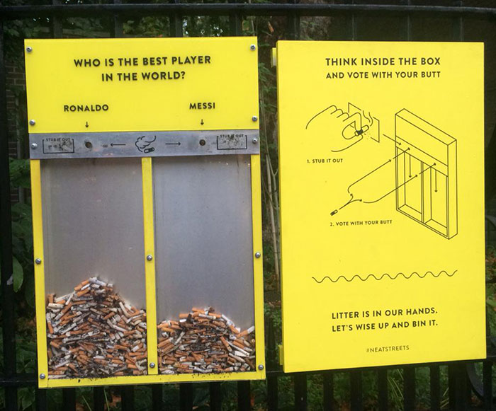 UK organization Hubbub plans to clean up the streets of London through its #neatstreets campaign. One clever project sees smokers vote on various topics by placing their cigarette butts into clear divided containers in public areas; another uses devices that play music when a cigarette butt is inserted; and yet another encourages gum-chewers to connect the dots on specially designed boards.