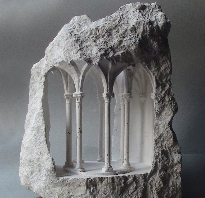 Chiseled doric columns, ornate arches, vaulted ceilings, staircases, and tiny sculptures within a sculpture—all of this fits into miniature architectural spaces that resemble ancient and medieval ruins and sacred architecture carved into raw marble and stone. These historical sculptures are brought to life by an internationally acclaimed British sculptor, Matthew Simmonds (previously here on Bored Panda), who currently lives and works in Denmark.