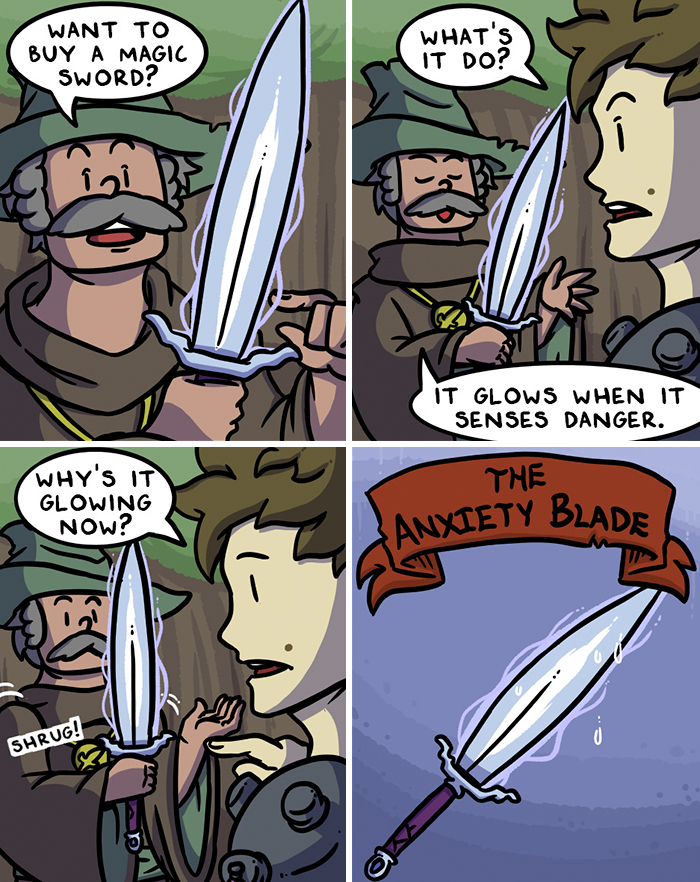 My name is Matthew J Wills, and I’m a cartoonist and video game tester from Wellington, New Zealand. I’ve made a few different webcomic series in the past, which were all shortly lived with a niche following. One day, just for fun, I made a silly webcomic about a doofus knight looking for a sword and was met with overnight success – it was a hit! I knew I’d tapped into something special with it, and I’ve been drawing Swords 3 times a week ever since. It’s a series aimed to make light fun of all kinds of fantasy tropes, without punching down or taking sides.