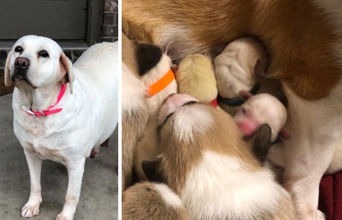 Lab mom Autumn Dove was rescued from an auction by the Lonestar Dog ranch and Dog Ranch Rescue. She was pregnant. She had issues with the delivery and ended up needing a c-section. After her surgery, she was still having issues. Sweet Autumn passed away on the operating table. Now there were four hungry lab puppies to feed! Enter Angela, the corgi momma. She had given birth two weeks ago to four pups and was still nursing. The foster mom of Angela, Jen, took a chance and gave one of the Labs to Angela. She immediately let it nurse and started cleaning him, like he was her own. Jen then introduced the other three lab pups to Angela. They latched on and fed right away. When Jen took the little labs to place them in an incubator to give the momma a break, corgi momma ran over to the incubator, barking as if to say, “Give me back my babies!” Jen gave them back, and they have stayed with her ever since.