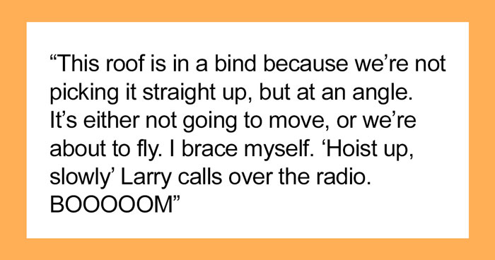 The crane ripped the roof off the construction while the poster and coworker were standing on it, both of them being sent flying with the roof