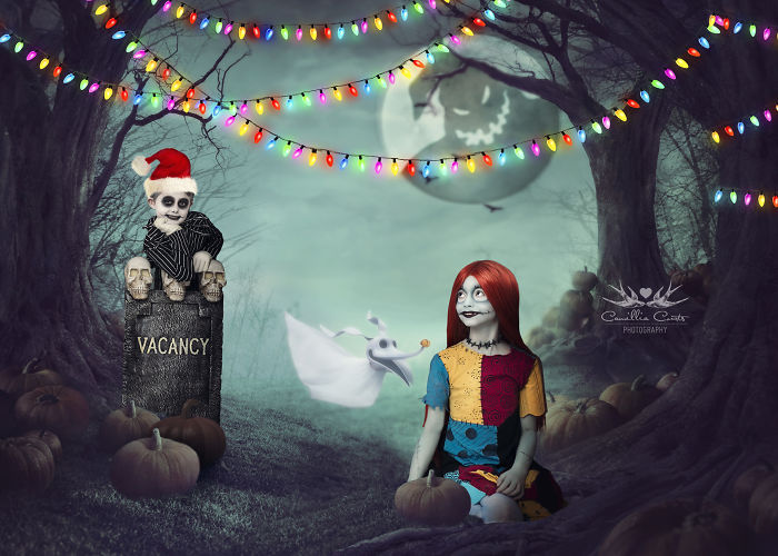 Photographer Camillia Courts and Make up Artist Missy Mackintosh, teamed up to create this super fun and adorable photo session with their kids for Christmas! Missy’s 6 year old son Evan and Camillia’s 8 year old daughter Layla made the perfect spooky pair from Disney’s The Nightmare Before Christmas.