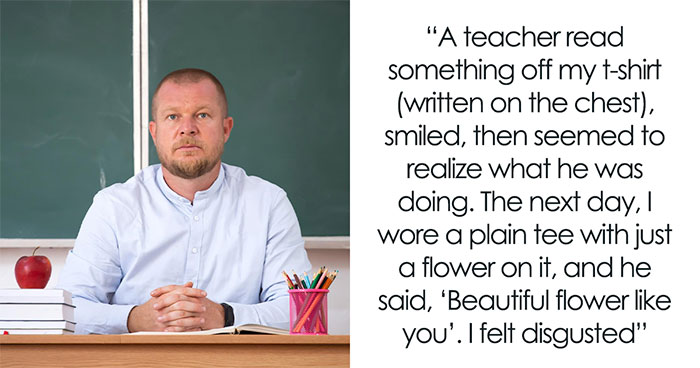 My teacher actually read a quote or something on my t-shirt (written on the chest area) like an idiot smiled later realized what he was doing, the very next day wore a tshirt without a quote or a single letter but a flower on it, mf said beautiful flower like you, felt so disgusted.