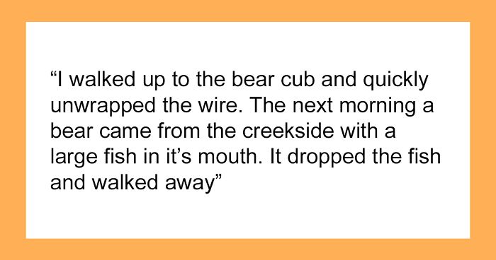 When I was a young man in my twenties I would go camping by myself often. On this particular time I had set up a tent in a small patch of grass not far from a creek. I was just walking to the creek with my pot to fill with water when I heard a strange squealing and went to investigate. I got to a steep bank and halfway down tangled in barbwire was a bear cub hanging by its neck and front leg squealing loudly. I looked and at the top of the bank was the mother and she was in distress calling and grunt/chirping ( the best way I can describe the sound.) My eyes met with the mother’s and I was caught off guard. I looked at her and held my arms out palms out fingers pointed down. I somehow knew it would be ok to help the cub. I walked up to the bear cub and held it by the scruff of the neck with one hand and quickly unwrapped the wire with the other and set the cub on the ground and backed away. When I got far enough away to feel safe I couldn’t see the bears anymore because of the bend in the creek and the bushes. It was nearly dark and I couldn’t move my camp so I just stayed the night. The next morning as I was packing up my tent a bear came from the creekside with a large fish in its mouth. It was about forty feet from me before I noticed it. It looked at me, dropped the fish, grunted and turned and walked away.