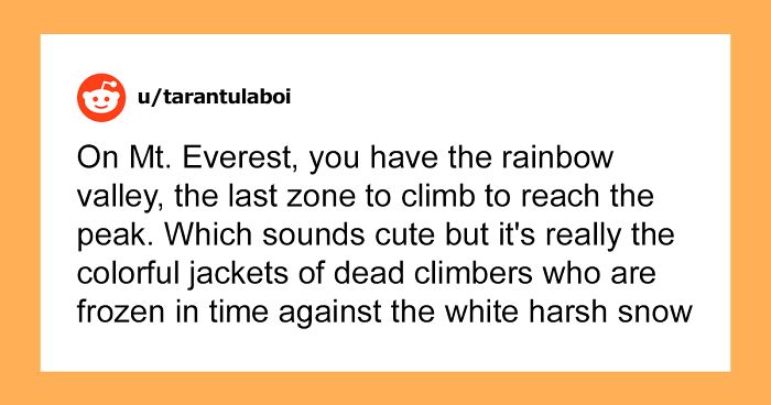 On Mt. Everest, you have the rainbow valley, the last zone to climb to reach the peak. Which sounds cute but it’s really the colorful jackets of dead climbers who are frozen in time against the white harsh snow.