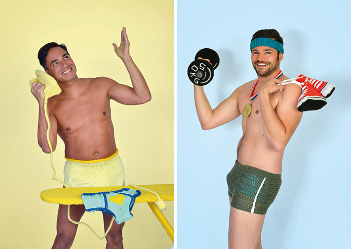 Darn! Men with yarn is a pin-up calendar featuring men in knitted and crocheted underwear posing with knitted props: an iron, a vacuum cleaner, a piece of a pie, a TV, a drill and lots more. And yes: these pictures are the ironic reference to the pin-up calendars showing girls with car parts and garage tools. We wanted to make the opposite by using men with yarn objects. And also opposite: we used men with real body’s from everyday life. Without fake body parts or Photoshop.
