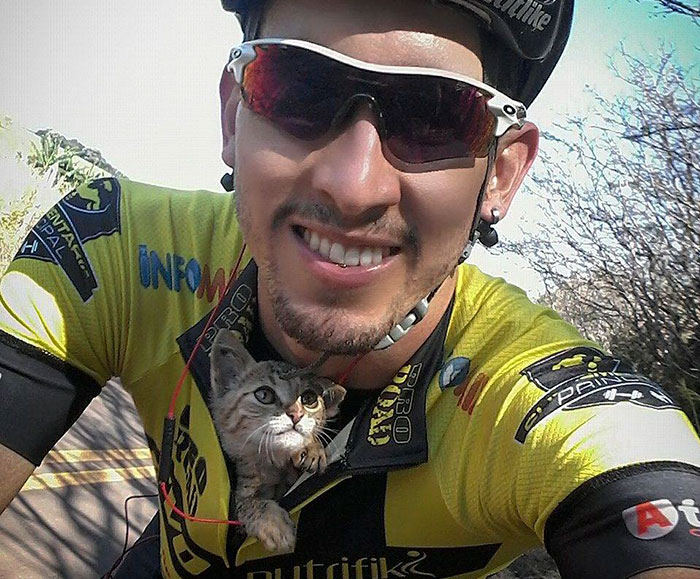 A few days ago Brazilian cyclist Viitor Fonseca was out for a ride on his bike when he saw a tiny tabby kitten in desperate need of help. He new that left on its own, the newborn will not be able to fend for himself and the kitty was clearly alone.