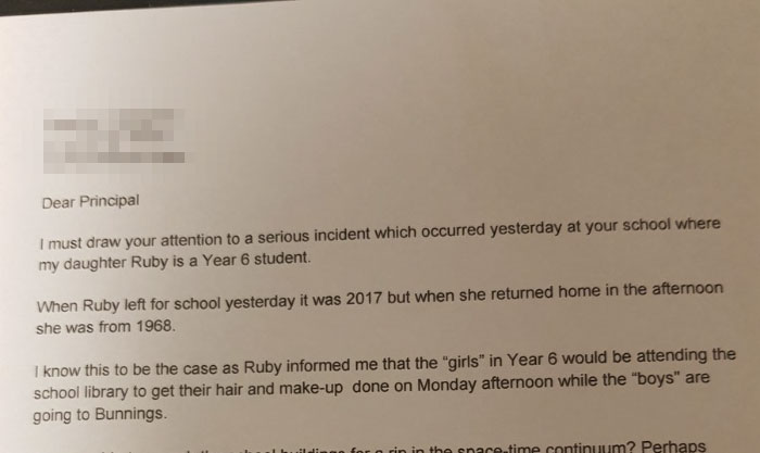 In the small village of Wongarbon, Australia, about 381 km northwest of Sydney, a strange phenomenon has taken place; a 12-year-old girl named Ruby Callaghan has apparently traveled back in time during a routine school day. Her father, in a state of disbelief, has written a letter demanding an explanation from the educational institute, claiming that his daughter left the house on Tuesday morning in the current year of 2017, was transported back to 1968 upon entering the school building, and was returned to him endowed with harrowing tales of gender-segregated field trips. “My reaction was one of disappointment,” Stephen Callaghan told Bored Panda.