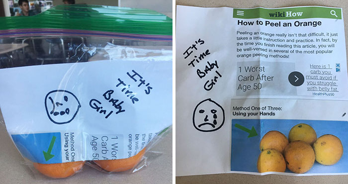 “It’s time baby girl,” read the note, packed into a plastic bag with two oranges with their skin still intact. “I thought it was just going to be a letter saying ‘Happy last day of school!’ or something,” Meg told Buzzfeed. “So when I opened it I couldn’t help but smile.” Why? Because inside the note was a printed page from Wikihow that contained complete instructions teaching Meg how to peel her own oranges! Meg tweeted a picture of the note and it’s since been shared over 110k times and liked by almost half a million people.