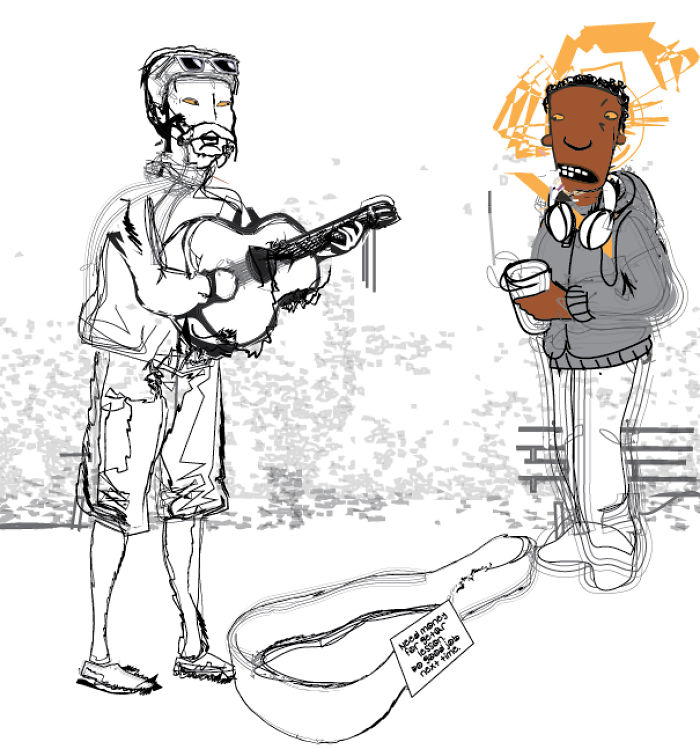 Here’s the thing. I love Starbucks. And I love larger-than-life characters, and it just so happens that there’s a Starbucks and larger-than-life characters on every corner of downtown Toronto. I’d love to believe that I’m one of these characters, but that’s giving myself more credit than I deserve. I’m a pretty uneventful guy. Urban black guys—I’m an urban black guy, by the way—are expected to be cool, athletic, suave and lyrical in a hip-hop sort of way. I’m none of these things. I can’t even dance. My mother, who is an avid dancer, loves me but nevertheless remains confused by all of this. She’s especially miffed by my fashion sensibilities, the extent of which is an old t-shirt and a pair of jeans that should have been in the laundry weeks ago. I cut my own hair, and I don’t always do a good job. I go to Starbucks every day to postpone for just one more day my crashing career as a graphic designer. The most interesting thing I did recently was figuring out how to cleverly lace my winter boots with only half the string length since the laces snapped six weeks ago, and I lack the motivation to go out into the snow and buy replacements. Right now I’m at Starbucks trying not to cry. Why? Because my life, and inhibitions, are exactly to scale. But the characters I see at Starbucks? These guys are all X-Large. Their inhibitions burst at the seam.