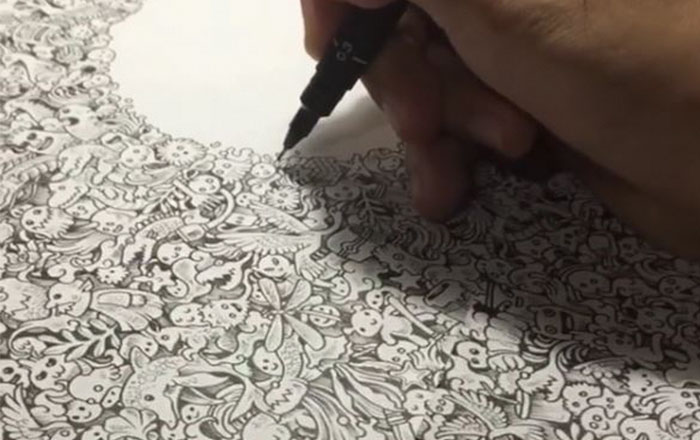 Philippines-based illustrator Kerby Rosanes uses black pens to create his stunningly intricate “doodle” worlds. ‘Friday Night’ is a perfect example of Kerby’s work: loads of tiny characters and elements come together to form a giant detailed masterpiece. However, don’t be fooled by its spontaneous style – pieces like these demand tremendous patience and concentration.