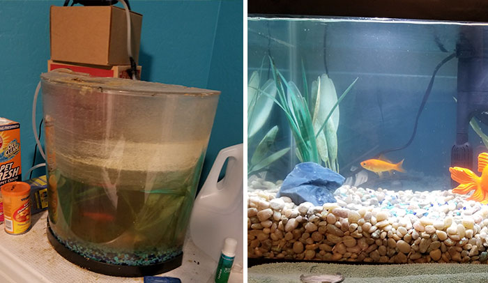 “So according to the aquarium dude, taking the fish from bad water to fresh quick is how you get a dead fishy. Which is fine cuz my aim was to spoil, and I needed time to slowly buy supplies.” The woman started slowly changing out the goldfish’s water, and after 2 weeks, the fish was fully upgraded to a cleaner existence.