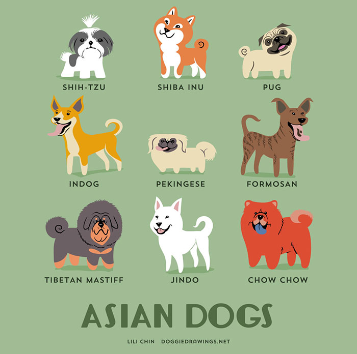 “The Dogs of The World series started when I was researching Asian dog breeds for another illustration project. I started drawing Asian dogs (shiba inu, pug, chow chow, etc).”