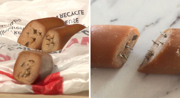Emma Medeiros was walking her dogs when she spotted something unusual in her backyard – it was three shiny pieces of hot dog just seemingly lying there for her doggies. When she got closer, the lady couldn’t believe her eyes – the sausage was pierced with razor blade fragments.