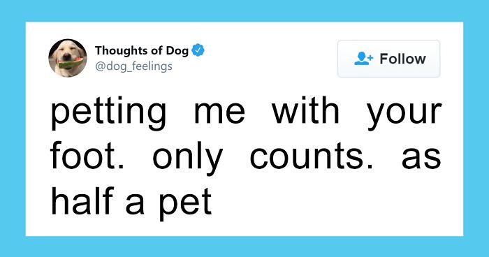 Dogs have many thoughts. They just can’t tell us about them. Except for this one. Twitter account @dog_feelings (previously here and here) is a humorous and adorable project that tries to experience the world through the eyes of our beloved pet dogs. Amassing nearly 3 million followers, it regularly shares the funny thoughts any pup might have. Like, the size of the outside. Or the purpose of the leash. Scroll down to check some of the best tweets out and who knows, maybe they’ll make you understand your dog’s thoughts more.