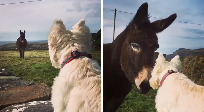 Buster the doggie lives with his humans in Dublin – but he is in a long-distance relationship with someone who is based in Ireland’s Dingle peninsula. It all started back in 2013 when Buster and his owner Traolach Ó Buachalla went there on holidays and met a tall dark donkey named Jack. Buster and the animal got on very well from the second they saw each other. “The first time they met, they were just so friendly to each other,” Buachalla told The Dodo.