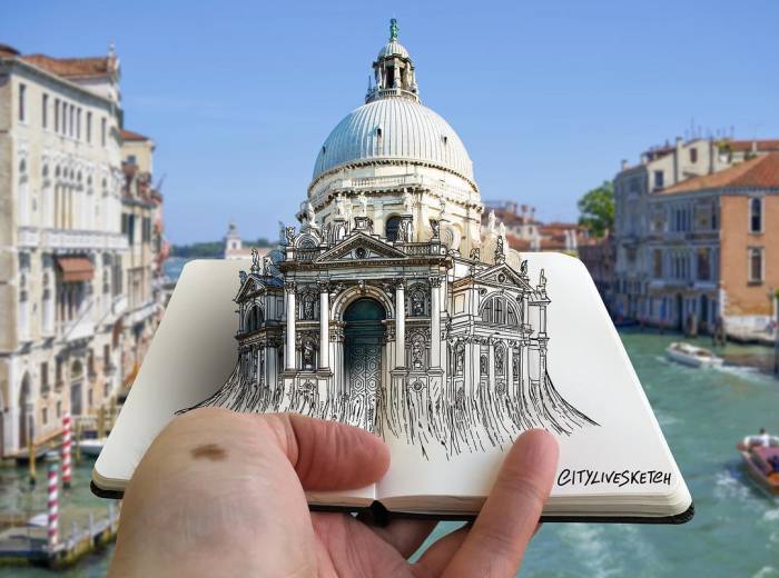 In the summer of 2014, Pietro started his project called City Live Sketch by drawing a first simple sketch in his sketchbook and photographing it in front of the scene that was presented. Those simple sketches later evolved into more complex drawings that combine different art techniques and definitely plays with our minds. Scroll down to see them for yourself.