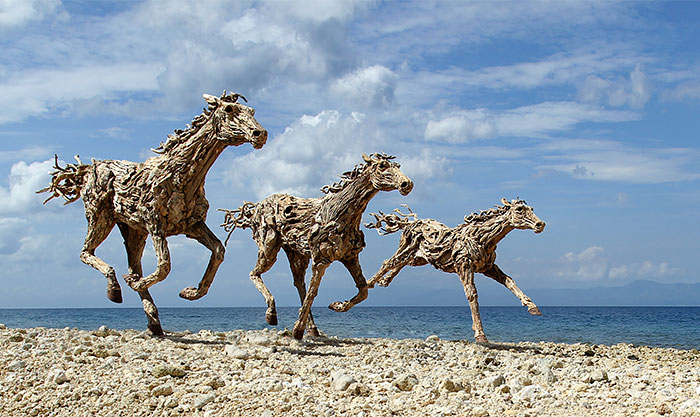 The beautiful pieces are assembled entirely out of pieces of driftwood. The driftwood’s seemingly fluid forms, carved by the waves, lend themselves perfectly to the galloping horses’ features. “The driftwood is very tactile and demands to be interacted with,” the artist told Bored Panda.