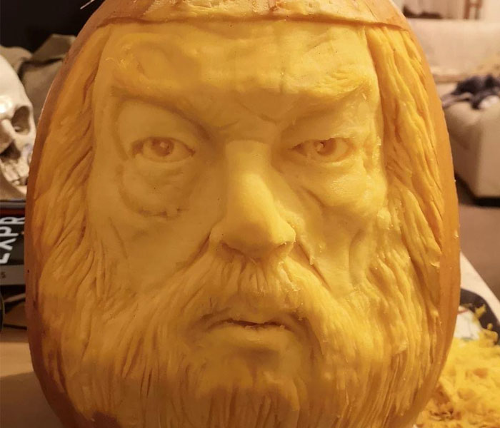 I work from a photo, so the main challenges are firstly just how deep the pumpkin will let you carve without breaking through the flesh, and secondly trying to convert a 2D picture into a 3D pumpkin—my pumpkins often look quite 3D from the front, but from the side, can look a bit flat.