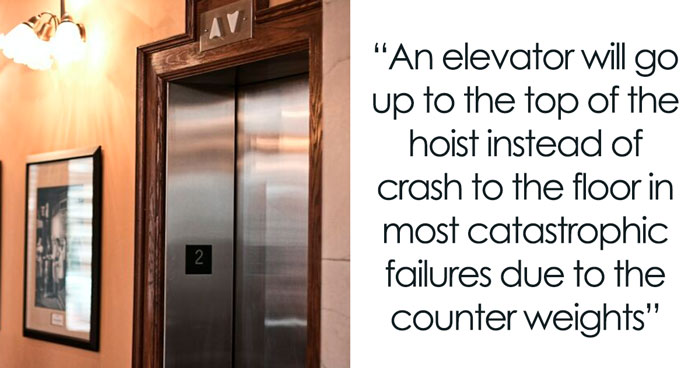 An elevator will go up to the top of the hoist instead of crash to the floor in most catastrophic failures due to the counter weights.