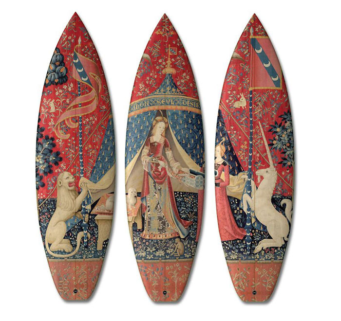 We create a series of special surfboards and skateboards, which reference some of the most famous European paintings. The collector’s item, which are all handmade in France, feature iconic graphics such as “The Lady and the Unicorn”, as well as a set of three boards – which together form a triptych of Hieronymus Bosh’s “The Garden of Earthly Delights”.