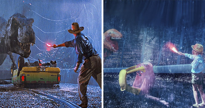 My daughter and I were in our living room hanging out when Matilda climbed atop an old plastic car and started surfing on it. I just happened to ignore all parental instincts of concern and instead recalled the iconic scene in Teen Wolf where Mike J. Fox surfs on top of Stiles’ van. That was the start of the recreation project that has now covered 73 iconic film images.
