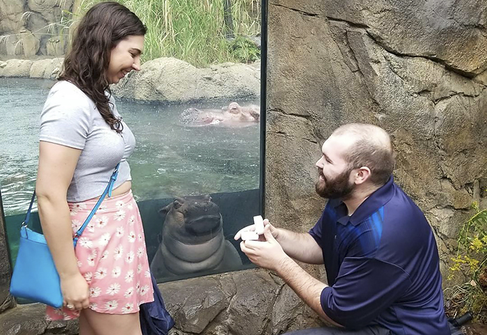 Hayley Roll was on a day-trip to the Cincinnati Zoo with her boyfriend, Nick Kelble, to visit viral superstar Fiona the Hippo when something amazing happened. Roll handed her phone to someone who agreed to take a photo of them, and when she turned back around, her partner of one year was down on one knee with a ring in his hand.