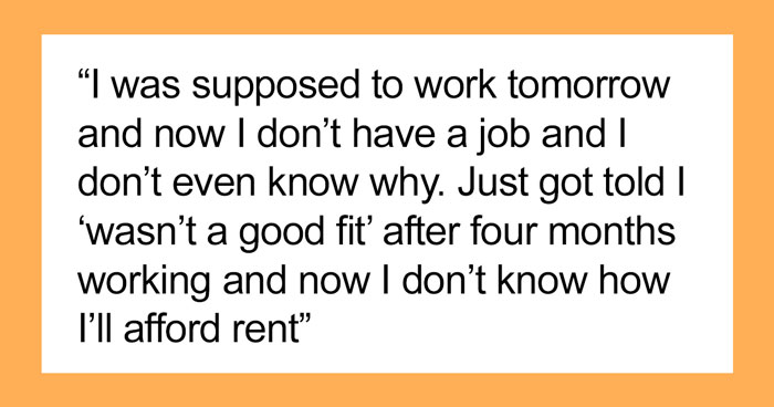 The author starts their story by sharing that they just got fired without any explanation and warning – they were simply told to not come back as they ‘weren’t a good fit’. OP rants that this was a boss that they were confident cared about his employees, and they were in fact feeling happy to have found a job that treated them like a person.