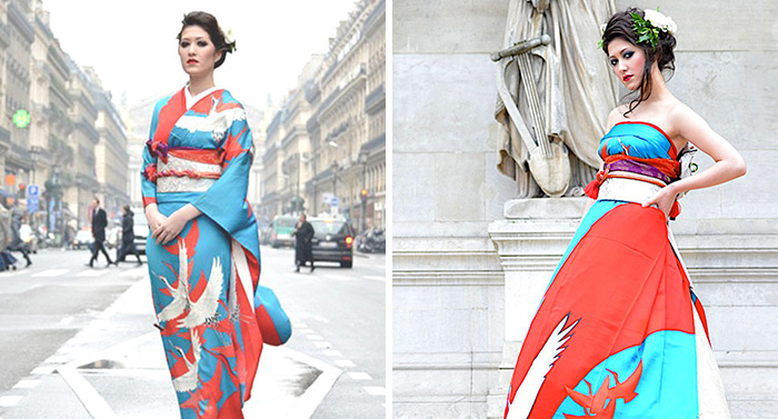 It’s not uncommon for modern Japanese weddings to combine Shinto wedding traditions with various elements of Western nuptials. Traditionally a Japanese bride would wear a furisode long-sleeve Kimono, but some brides are modifying their garments to add their own unique spin on the traditional Western wedding dress. By folding the sleeves down and tying them into a decorative bow at the back, their Kimonos are suddenly turned into elegant strapless dresses. The best part is that because the alterations are all superficial, the wedding dress can easily be turned back into a Kimono. So instead of having a wedding dress that you wear once and then leave in the closet to collect dust forever, why not try something different? (h/t: rocketnews)