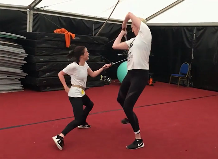 Also, bear in mind that George R. R. Martin created Arya as a left-handed character but Maisie is not. Originally. “I’m right-handed, and when Mom was reading the first book, she told me about Arya being left-handed,” she told TV Guide. “From then on, I was like, ‘Alright, I’m going to try to do everything left-handed.’ When I was practicing out in the garden and things I would do left-handed just to feel that rhythm.” Not all scenes in the crowd-pleasing series display Arya as a leftie, though. “Sometimes I have to do things right-handed because of the camera angle and things like that. So some people are a bit annoyed that Arya hasn’t done everything left-handed. I wanted to. I really did. But sometimes it was just too tricky and we couldn’t do it.” Judging from this action sequence, Maisie would have nailed it every time.