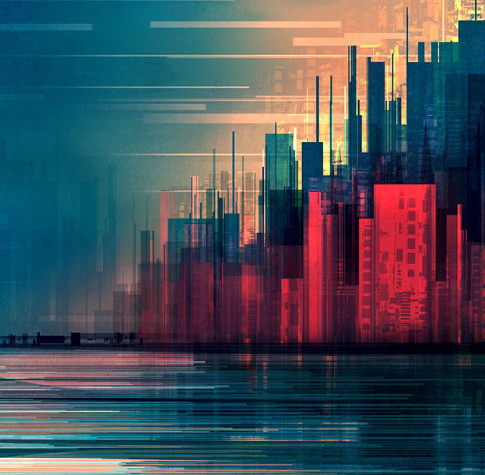 Illustrator Scott Uminga stacks hundreds layers to create vibrant landscapes and cityscapes. His geometric style resembles photography by Fong Qi Wei and continues to evolve throughout time.