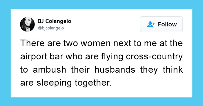 The only thing more fun than people-watching is eavesdropping, especially when a major scandal in someone else’s life is unfolding right before your ears. 27-year-old Brittney-Jade Colangelo was at an airport bar in Ohio when she overheard the two women next to her discussing a devious plan over multiple rounds of shots, and since she figured the Internet would be just as interested in what was going down as she was, she pulled a pro move and live-tweeted the entire thing. Though she knows them only as ‘Shot Lady,’ the more experienced drinker of pair, and ‘Gum Lady,’ due to the ‘extreme couponer’s’ amount of gum in her purse, the glimpse she gives us into their personal lives is shocking.