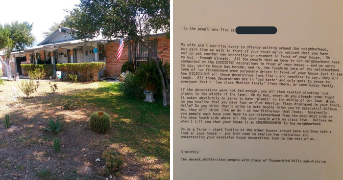 Three days ago, Twitter user @goldenstef posted a picture of a disgusting letter her grandpa had received. In it, his neighbors ridicule his house decorations, saying they’re ‘excessive’ and ‘bad taste.’ The senders signed it as ‘decent, middle-class people’ but the contents of the letter clearly show they’re anything but. I mean, how self-conscious and insecure they must feel if the only way they can raise their self-esteem is to diminish others?