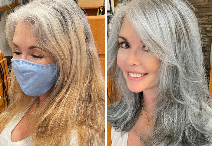 This gorgeous client came to see me from Salt Lake City, she has naturally red head and she was coloring her hair red for years, she started getting grey and wanted to embrace het grey and stop coloring her hair completely. I tried to give her strawberry icy blonde silver to match her roots pattern and as you see in the photos she looks amazingly beautiful.