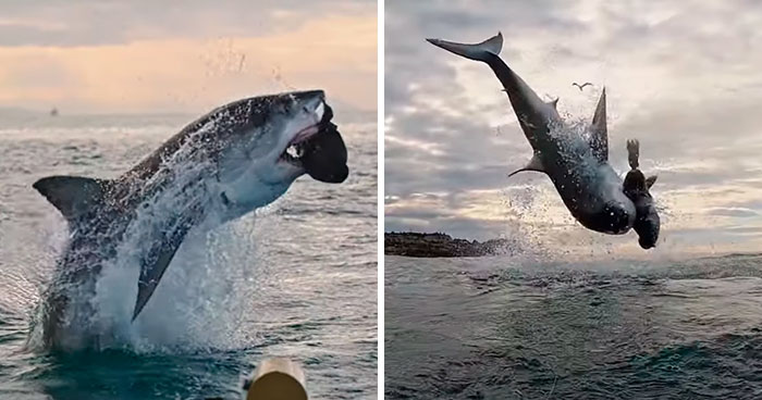 He and his team were out patrolling the waters with some meaty bait tied to their boat to encourage a shark to make its move. After several tries, Fallows found the shark he was looking for. Video footage shows how the shark launches itself from the water, biting on its new-found treat strapped to a rope, and flying (what was estimated to be) 15 feet into the air.