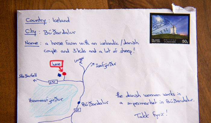 So, instead of putting an address on the envelope, he drew a map which leads to a farm in Hvammsveit, West Iceland, with a red dot marked on the destination. The envelope reads: ‘Country: Iceland. City: Búðardalur. Name: A horse farm with an Icelandic/Danish couple and three kids and a lot of sheep!’. It also has a little clue in the corner saying that ‘the Danish woman works in a supermarket in Búðardalur.’ How cute!
