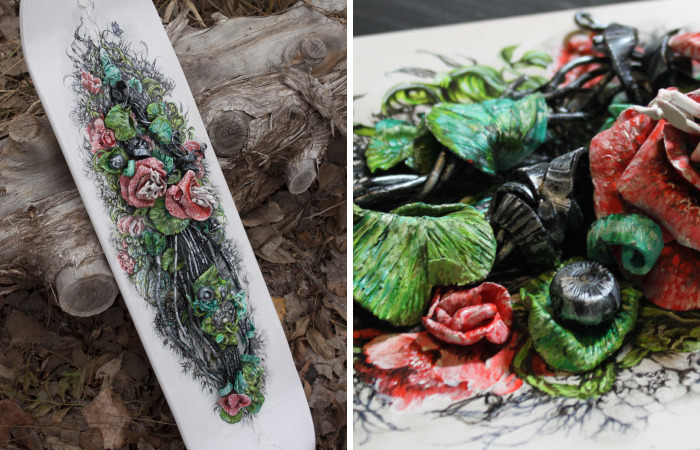 As an acrylic artist, the sky is the limit. Such a versatile medium means endless possibilities. For me, painting canvases led to painting wood panels, which eventually led to painting guitars, skatedecks and nearly every other blank surface I could put slap paint on. As a gallery artist, my wood panels evolved with sculpted elements adhered to the piece, and it made sense to begin doing the same thing with my hand painted skatedecks. This is the first one complete, with three others currently underway. The clay sculpture adds a whole new dimension to the work, and makes these decks a unique piece of decor whether they hang on a wall or accent a tabletop. Adding the clay is a time consuming an arduous process, as every piece is hand sculpted and none use molds. The end result is a truly one of a kind work of art.