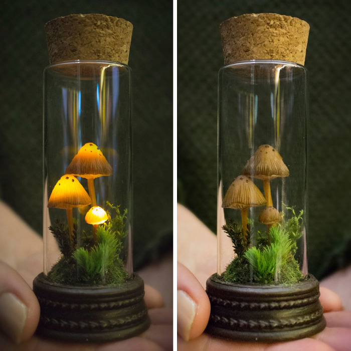 “One of a few survivor specimens found in the place that humans call the wanderers’ library. Only the thin glass vial preserves the explorer from their poisonous touch in exchange for which, these mutated in a flame of alchemic-catalyst mushrooms will lit their light for the world that is alien to their kind. ”