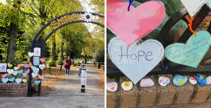 I hung 150 handwritten “hearts of hope” on the entrance to my local park in aid of the World Mental Health Day and mental health awareness.