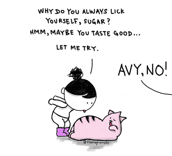 I’ve written down all the little nuggets of innocent quips Avy’s dropped from when she first started forming longer sentences at 2, and one day decided to create them into a comic to share with everyone and make their day a little more smiley. Welcome to the wonderful and heartwarming world of Avy and Sugar, where Avy greets you and bids farewell to you in exactly the same way: “Hello okay goodbye I love you!”