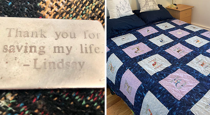 On the back, she handsewed secret images about funny things that have happened to us, places we’ve been, etc.