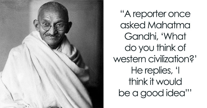 “A reporter once asked Mahatma Gandhi, “What do you think of western civilization?” He replies, “I think it would be a good idea.”‘