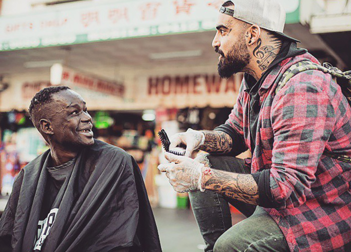 Inspired by his personal battle with drug addiction and the tenets of his Baha’i faith, Nasir Sobhani, a Melbourne-based barber known as the “Street Barber,” skateboards around the city giving free cuts to homeless people on his days off and spending time talking to them with the hopes of inspiring them to start fresh.