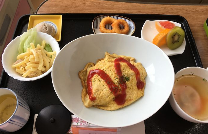 Omuraisu, Macaroni Salad, Chicken Soup, Squid Rings, Fruit, Green Tea