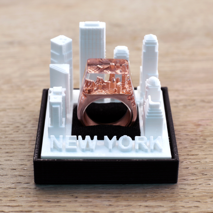Teti is a super detailed micro-sculpture, modeled in the form of a wearable high jewelry ring, plated with precious materials and encapsulated in transparent and indestructible resin. The rings featuring significant geographic icons from cities all over the world and give you the possibility to celebrate your favorite city by keeping it wrapped around your finger.