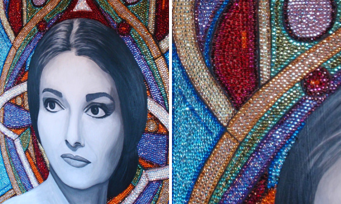I had painted and exhibited a portrait of legendary opera Diva Maria Callas, but somehow always felt that “something was still missing. So I went to work, individually gluing 13,000 genuine Swarovski Crystals in 17 different colors to the canvas.