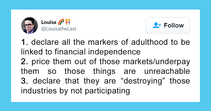 While it’s easy to jump to reductive claims and say that the current generation is lazy and entitled, the financial independence and other adulthood markers are not so easy to reach for today’s youth. The point was proven perfectly by a young woman on Twitter – Louisa shared her opinion on the so-called adulthood markers. According to her, the system is built to keep people just barely above water while at the same time bullying them for not conforming to the standards set by previous generations. Scroll down below to read Louisa’s tweets and don’t forget to tell us what you think in the comment section.