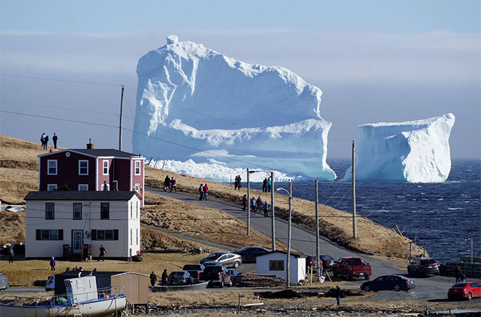 A small fishing village on Canada’s East Coast has been hit by a sudden flood of tourists after a 150ft tall iceberg became visible near its shoreline over Easter weekend, and they might have to get used to it.
