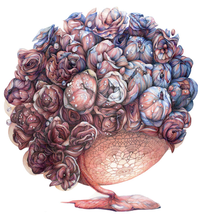 I tried to create a series of drawings that examine the forgotten and neglected connection between the female tactile body and wild nature. To do this I fuse images of human organs with budding flowers, ribbons and butterflies to appear as a singular functioning unit.