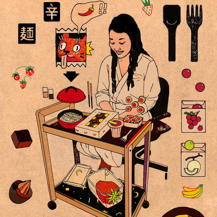 My works are almost like comics without panels. One drawing is one big panel, in which the whole story is contained. I use elements of graphic design to tell a story, they form relationships with the characters and reveal their personalities.